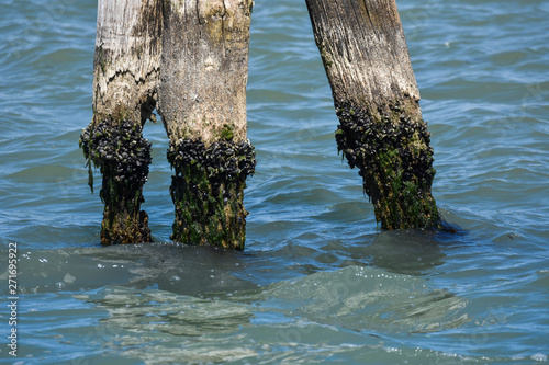 Obraz premium Wooden bricole ,wooden mooring poles in the water, Venice, Italy,2019