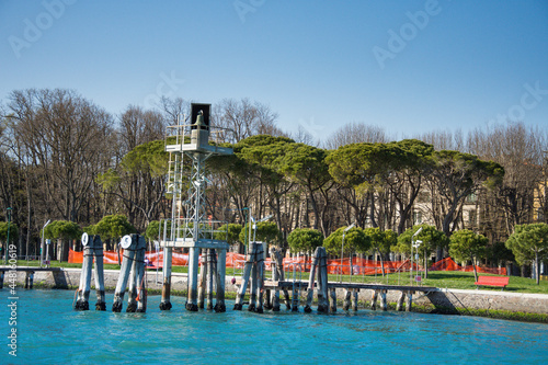 Obraz premium Wooden bricole ,wooden mooring poles in the water, Venice, Italy,2019