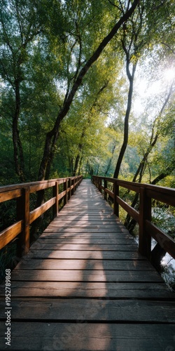 Fototapeta premium Wooden bridge boardwalk with railings through sunlit forest trees casting long shadows along the pathway for a peaceful nature walk