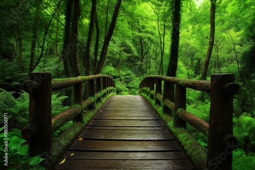 © Dreamdecko, Obraz premium Wooden Bridge Covered in Moss Leading Through a Lush Green Forest