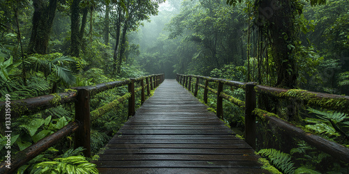 © Thanthara, Obraz premium wooden bridge covered in moss leads through lush tropical rainforest
