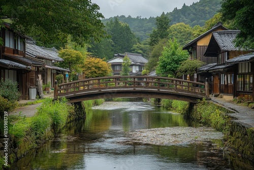 © Michael, Fototapeta premium Wooden bridge crossing canal with autumn foliage in charming european village