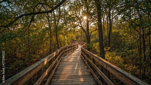 © Sona, Fototapeta premium Wooden bridge in forest during sunset. Nature, walkway, and trees. The concept of outdoor exploration and serenity. Scenic nature walk.