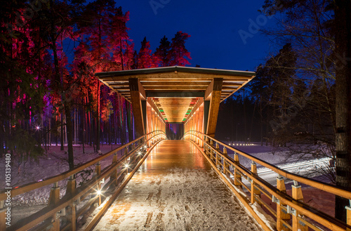 © Aleks Kend, Obraz premium Wooden bridge in the forest park. Night multicolored lights.