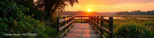 © Machita, Fototapeta premium Wooden bridge is adorned with vines as it spans wide marsh at sunset, foliage, sun