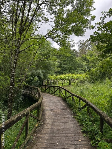 © Sergei, Fototapeta premium Wooden bridge on a lush green forest path near Salvaterra de Miño, Galicia, Spain, May 2024