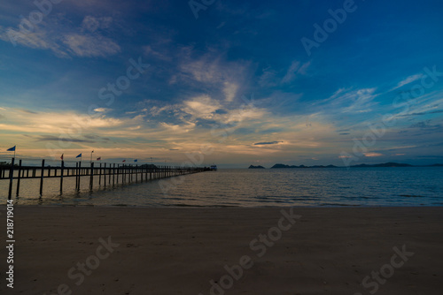 © themorningglory, Fototapeta premium Wooden bridge on sea beach sunrise colorful sky