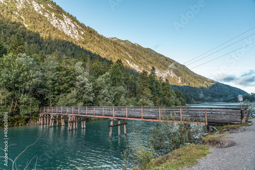 Fototapeta premium Wooden bridge over Plansee lake in Austria morning