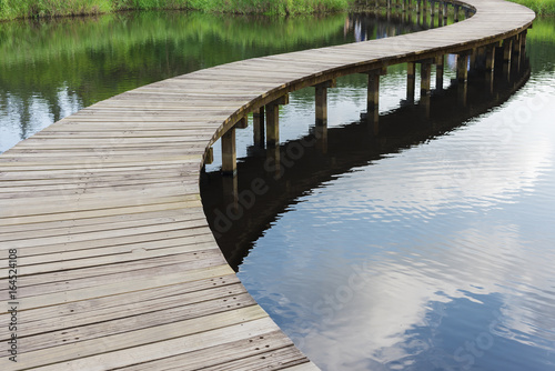 Naklejka premium Wooden bridge over river in green park