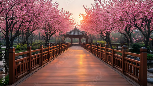© Ainul, Obraz premium Wooden Bridge Pathway Through Cherry Blossom Trees at Sunrise