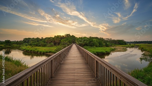 © NeuralNiche, Naklejka premium Wooden bridge spanning the river, showcasing structural integrity and accessibility