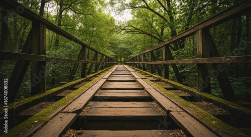 Fototapeta premium Wooden bridge stretching into a forest, leading into a depth of green
