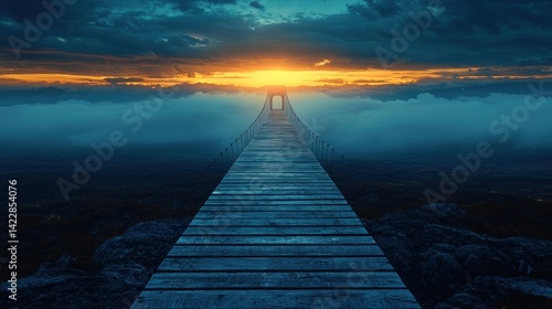 © intan ptra, Naklejka premium Wooden Bridge to Sunset over Misty Landscape