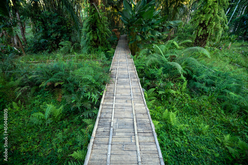 © sihasakprachum, Obraz premium Wooden bridge walkway Bamboo bridge spanning to the garden