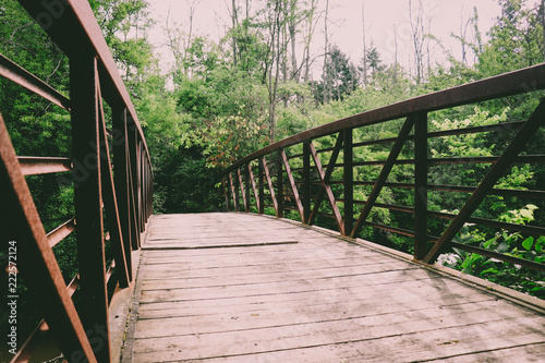 © Nicholas, Obraz premium Wooden bridge with iron railings covered with thick green brush to either side