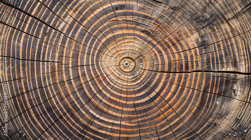 © mhebub, Fototapeta premium wooden Brown texture of tree rings with close up wooden background. Generative AI.