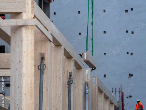 Fototapeta premium Wooden building elements being positioned on a construction site with visible...