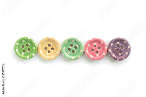 Fototapeta premium Wooden buttons with colorful stripes and colorful dots on a white background