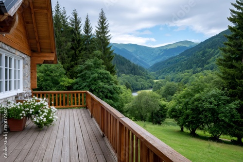 Obraz premium Wooden cabin balcony overlooking green mountain valley
