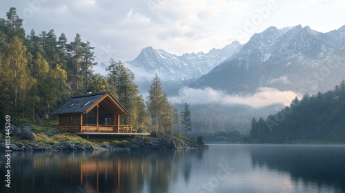 Fototapeta premium Wooden cabin by a serene lake, nestled amongst majestic mountains. Ideal for travel, nature, and peaceful living concepts.