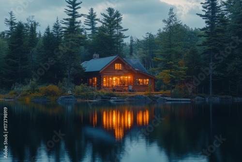 Fototapeta premium Wooden cabin reflecting on a calm lake surrounded by pine trees