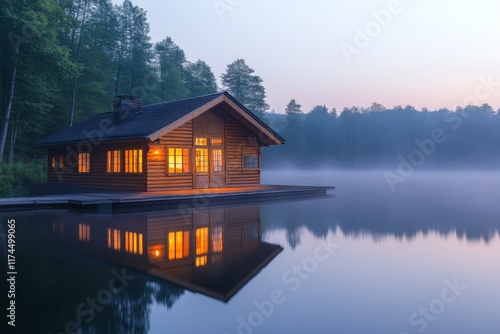 © Andrii Savchuk, Fototapeta premium Wooden cabin reflecting on a tranquil lake during golden hour