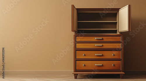 © Vladyslav, Fototapeta premium Wooden cabinet with open doors and empty shelves in a minimalist room featuring a warm wall color