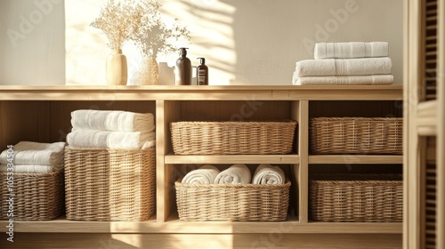 © Intach, Fototapeta premium Wooden cabinet with rattan storage baskets and minimalist decor items, reflecting a blend of function and beauty.