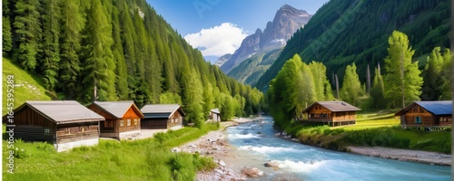 Naklejka premium Wooden Cabins by Rushing River in Mountain Valley