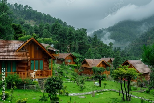 © Fitry, Obraz premium Wooden Cabins Nestled in a Misty Mountain Valley