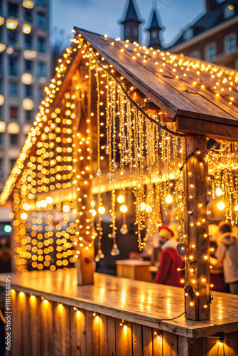 Obraz premium Wooden Christmas market stall with twinkling holiday lights