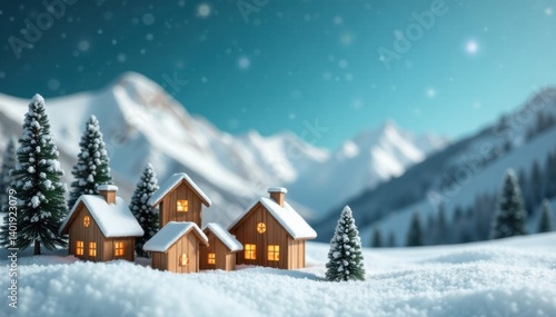 Naklejka premium Wooden Christmas village on a snowy mountain background, festive scenery,...