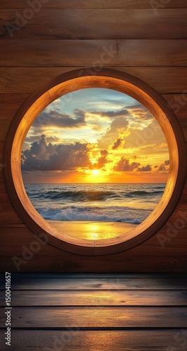 © Abdullah, Fototapeta premium Wooden circle window on a beach sunset