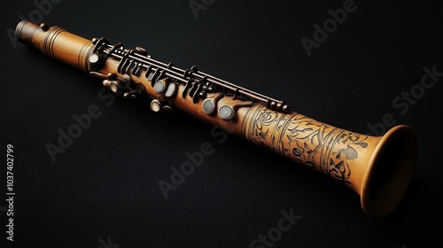 © mirifadapt, Naklejka premium wooden clarinet with intricate engravings and a warm