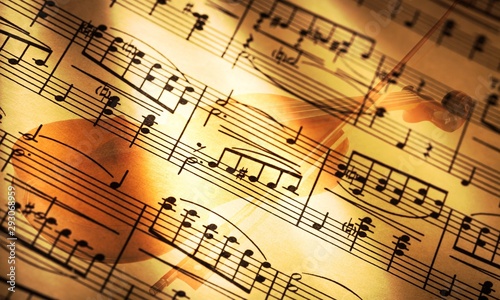 © BillionPhotos.com, Fototapeta premium Wooden classic violin silhouette with music note paper background