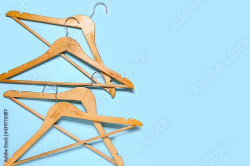 © Pixel-Shot, Fototapeta premium Wooden clothes hangers on light background