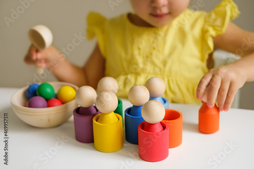 © Maryna, Obraz premium Wooden colored toy for learning colors and developing logic of preschoolers. A child plays at a table in the children's room with cups, balls and cylinders. Preschool education