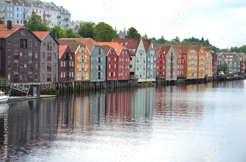 © Jordi, Naklejka premium Wooden Colorful Houses Along the River in Trondheim, Norway