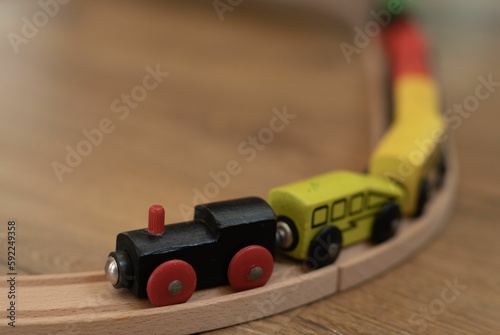 © Enric Nogueras Monserrat/Wirestock Creators, Fototapeta premium Wooden colorful toy train railway construction on the floor
