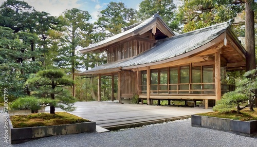 © andrew, Fototapeta premium wooden concept image of modern architecture in the style of old oriental, asian and Japanese buildings surrounded by traditional Japanese garden with trees, sakura, blossom, concrete path and wood