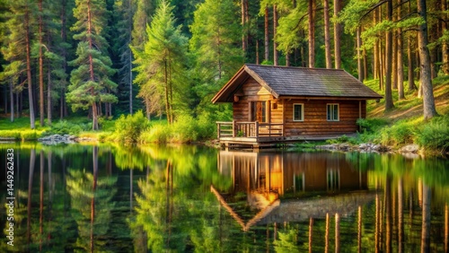 Fototapeta premium wooden cottage in forest by lake, summer, lake, summer, lake, water, nature,...