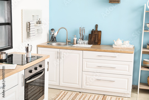 Obraz premium Wooden counters with silver sink and cookware in kitchen