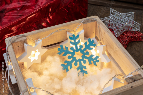 © LariBat, Obraz premium Wooden crate with glowing star and snowflake ornaments on fluffy white base. Christmas decor, festive display, holiday lighting. Real photo