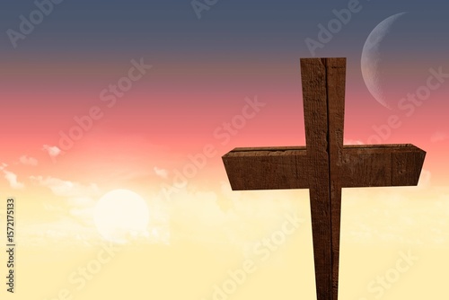 Obraz premium Wooden cross is standing in flat design gradient horizon sky, with bright sun and faint moon