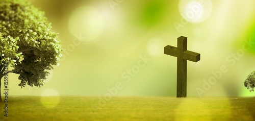 Obraz premium Wooden cross is standing in flat design meadow, glowing under warm green...