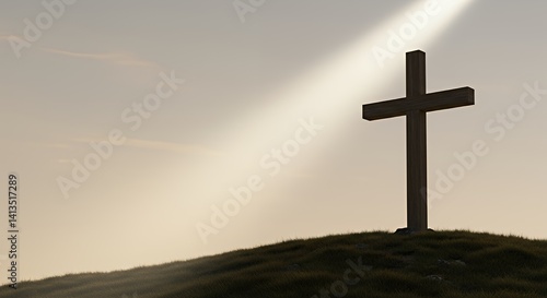 Naklejka premium Wooden Cross on Hill with Sky and Light Beam