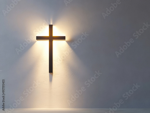 Naklejka premium Wooden cross on wall illuminated by sunlight