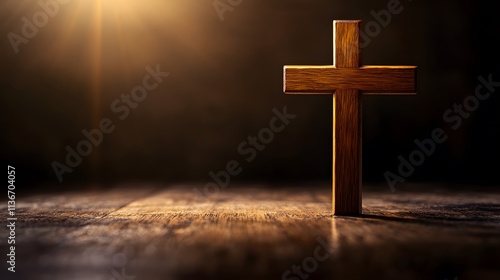 © irawan, Naklejka premium Wooden Cross Rests on Dark Wooden Surface