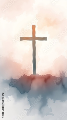 © Adames Art Studio, Obraz premium Wooden cross silhouetted against a sunrise sky.