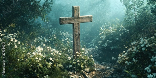 Naklejka premium Wooden cross surrounded by wildflowers in a serene forest clearing during early morning light